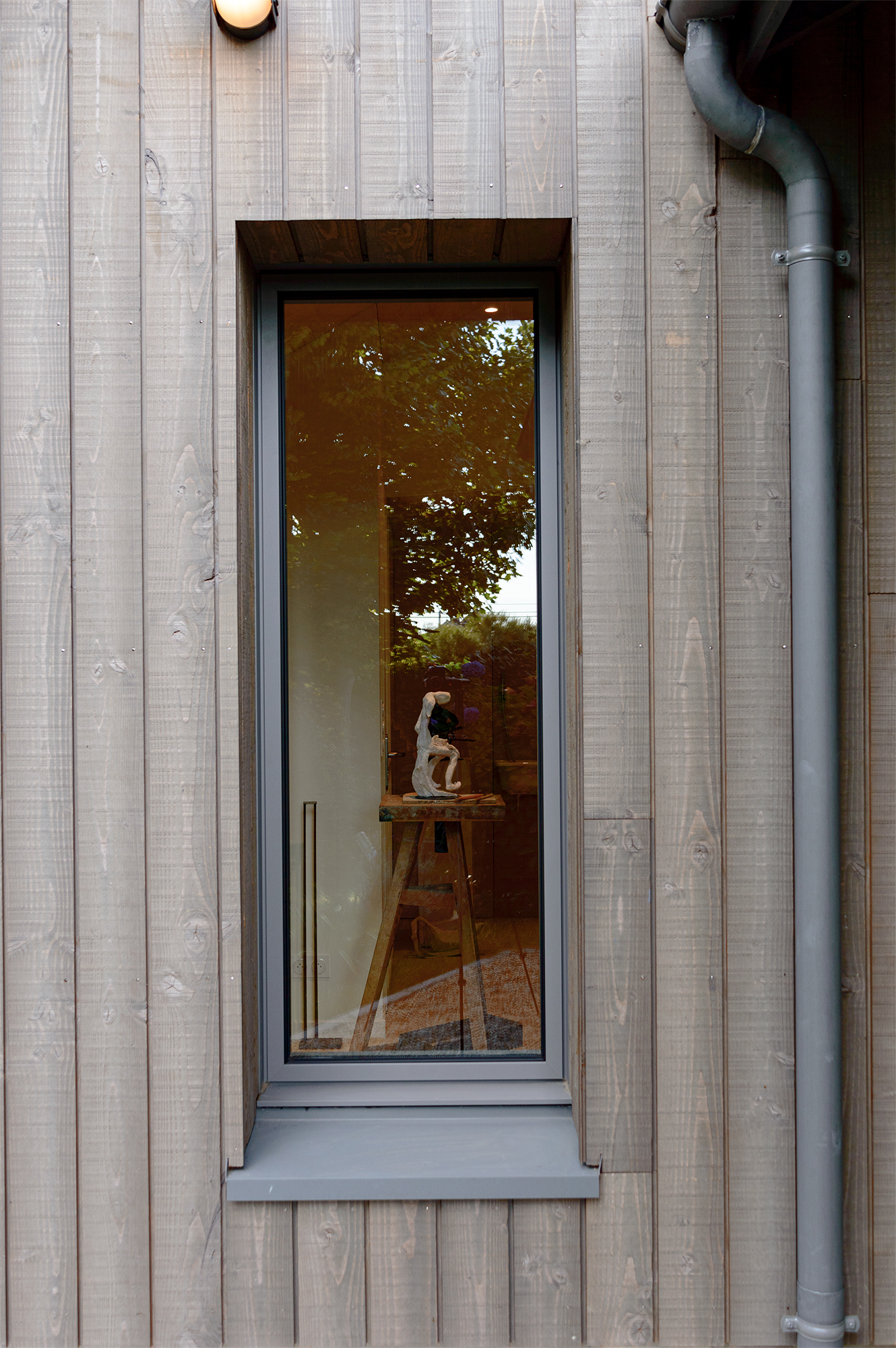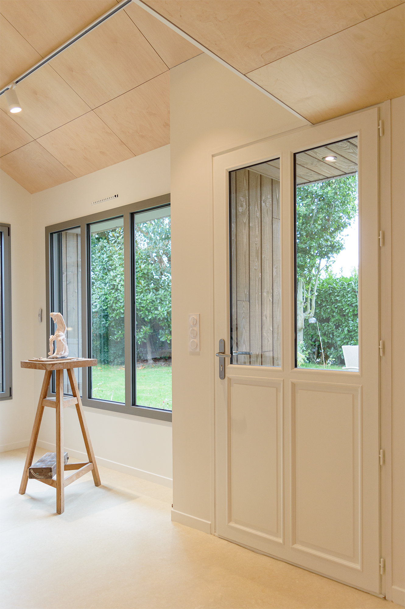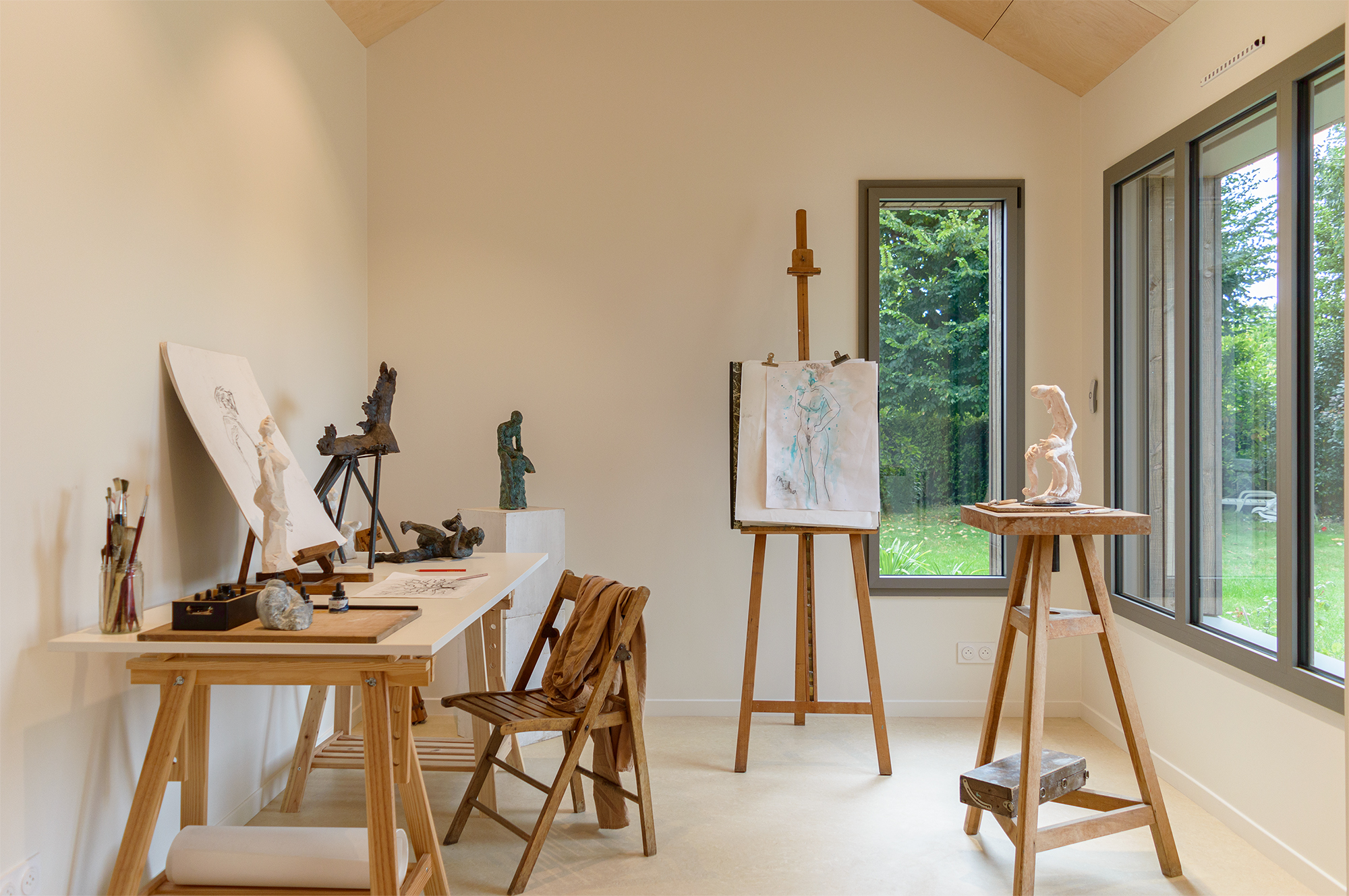 L’idée est de créer un espace de création ouvrant des vues sur le jardin, mais aussi de donner de la personnalité à cette maison standardisée.